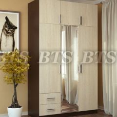 Красивая классическая модель трёхстворчатого шкафа Фиеста прекрасно впишется в интерьер спальни или гостиной. Центральная створка у модели – зеркальная, под ней находятся два выкатных ящика. Внутренняя комплектация состоит из отделений с хромированными штангами и зоны с полками для хранения трикотажа или белья. Шкаф выполнен в комбинации цветов венге и лоредо.